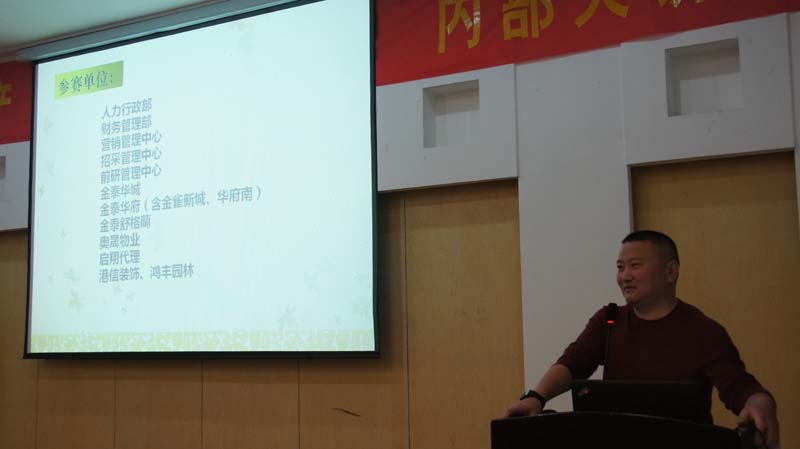 本屆活動(dòng)由運(yùn)營管理中心組織。參賽單位由人力行政部、財(cái)務(wù)管理部、營銷管理中心、招采管理中心、前研管理中心、金泰華城、金泰華府(含金雀新城、華府南)、金泰舒格蘭、奧晟物業(yè)、啟翔代理、港信裝飾、鴻豐園林11支代表隊(duì)組成。