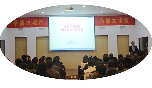 11月23日,公司在六樓會(huì)議室召開了由奧晟物業(yè)項(xiàng)目經(jīng)理徐道偉主講的“金泰華城項(xiàng)目物業(yè)承接檢查方案”專題培訓(xùn)會(huì)。公司全體員工參加了本次培訓(xùn)。