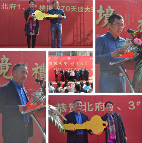 在氣勢(shì)雄渾的軍樂(lè)鑼鼓隊(duì)和精彩紛呈的舞獅表演之后,北府提前交房?jī)x式正式開(kāi)始。泰盛恒地產(chǎn)伏總、業(yè)主代表及物業(yè)公司周總分別進(jìn)行致辭并進(jìn)行交接鑰匙儀式,隨后物業(yè)同仁進(jìn)行服務(wù)宣誓。接著在喜慶的鞭炮聲中,現(xiàn)場(chǎng)業(yè)主開(kāi)啟溫馨交房之旅。