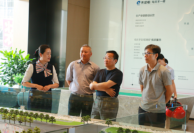 隨后,趙總一行來到了位于金泰·舒格蘭對面的金泰·瑞府項目,先后視察了金泰.瑞府售樓處、景觀示范區(qū)及別墅樣板間,詳細了解了該項目的區(qū)域規(guī)劃、周邊配套情況、銷售情況、市場前景等。趙總對瑞府項目獨具特色的園林及建筑風格,精工細作的樣板間,銷售人員的精神面貌表示了極大的認可。